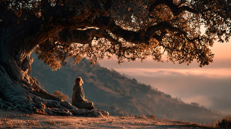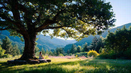 A peaceful moment of a person sitting quietly under a large tree with no devices, embracing nature. Ideal for wellness, mindfulness, and slow living themes.