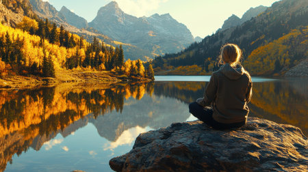 A woman sits cross-legged on a rock, facing a serene lake reflecting vibrant autumn trees and majestic mountains. The golden hour casts a warm glow over the scene.