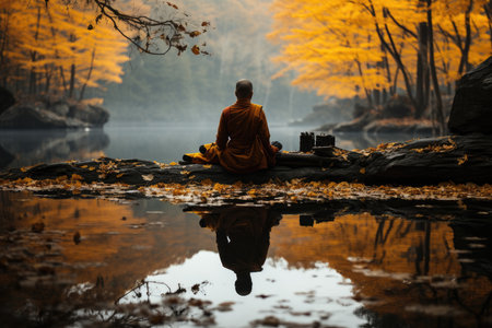 Monk meditates next to the autumn lake surrounded by golden leaves., generative AI