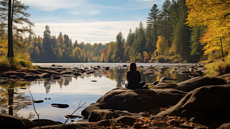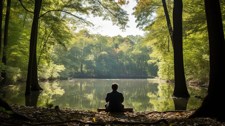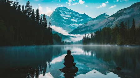 A masterful photograph depicts a person sitting in profound meditation in the heart of a tranquil wilderness Every intricate detail of nature from the delicate ripple of a nearby lake to the vibrant hues of foliage comes to life embracing the essence of mindfulness and connection to nature within the frame capture the profound stillness the gentle whispers of leaves and the tranquil aura that encapsulates the scene inviting viewers into a moment of peaceful introspection Let the photograph inspire a deep sense of calm unlocking the power of mindfulness and promoting mental wellbeing