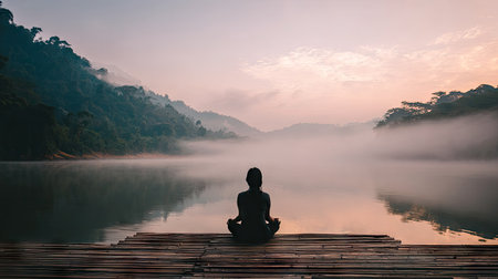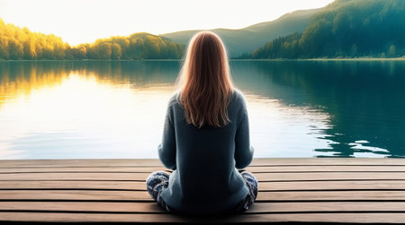 Peaceful woman meditating in nature by the lake at dawn, embracing serenity and calm thoughts