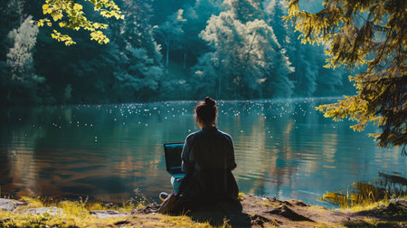 Woman sitting on a rock by the lake and working on laptop