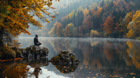 Meditation by the Calm Lake Surrounded by Colorful Autumn Foliage at Dawn