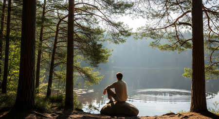 A lone man sits on a large rock by the edge of a calm forest lake, looking out at the water and trees illuminated by sunlight. The scene captures a moment of solitude, contemplation, and deep connection with the peaceful natural environment.