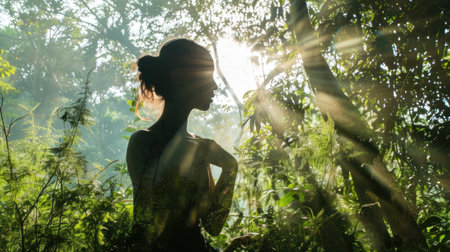 Sunlight streaming through lush green foliage onto a person meditating.
