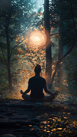 Meditation in a tranquil forest setting during twilight with sunlight filtering through the trees and creating a calming atmosphere