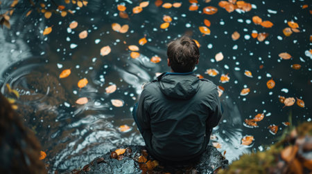 A man sits on a rock by a lake, looking out at the water. The scene is peaceful and serene, with the man's reflection in the water adding to the sense of calm. Concept of solitude and contemplation