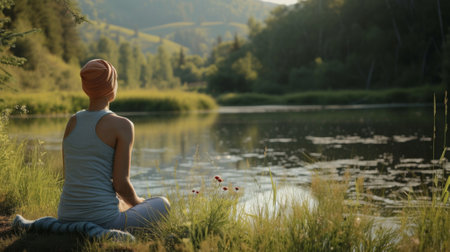 Woman finding calm and wellness practicing meditation by a serene lake in nature