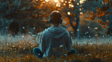 man listening to music, meditating in a forest generative ai
