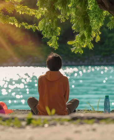 Mindful meditation, serene lakeside, self-reflection journey, focusing on personal growth and healing, photography, Backlights, Vignette, Point-of-view shot