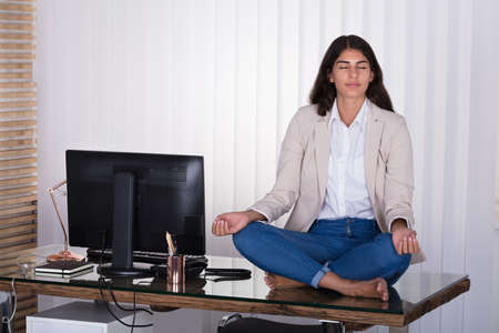 Young Office Female Worker Meditating On Top Of The Desk In Office