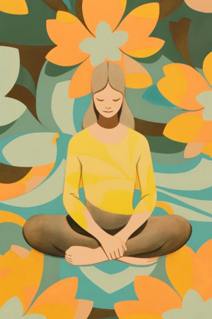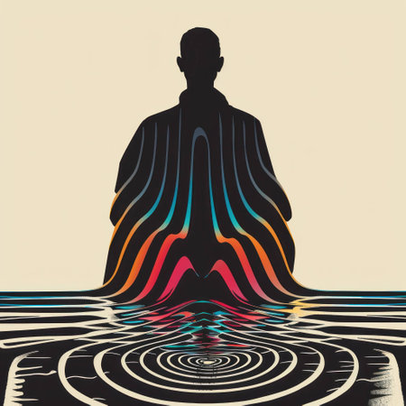 Abstract illustration of a meditative figure with vibrant flowing patterns representing inner peace and mindfulness. A calming and inspirational concept.