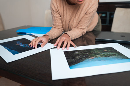 top view of the hands of a woman making a selection of pictures on a selection process of images on a desk after a photoshoot - focus on the center of the image