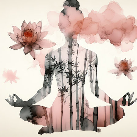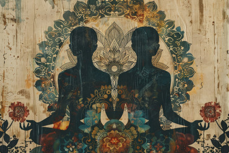 Serene meditation figure merges with a vibrant floral pattern, embodying tranquility and harmony in soothing shades. Perfect for peaceful inspiration. Generated A.I.