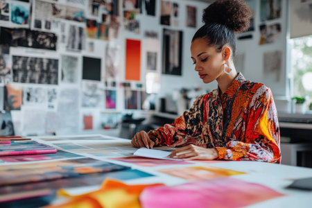 A woman leans over a table, evaluating printed landscape photographs. A laptop and blue folder are visible, suggesting a workspace setting.
