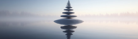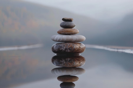 Stacked grey stones balanced on a reflective surface with misty mountains in the background