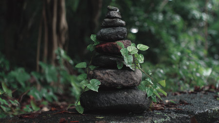A stack of stones rests on a surface, surrounded by greenery and plants. The scene shows the connection between nature and human effort.