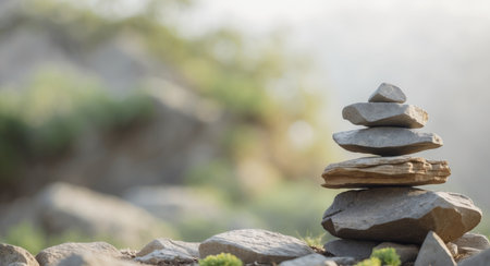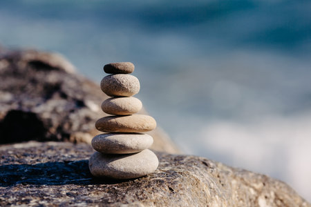 A carefully balanced stack of zen stones stands as a symbol of stability and mindfulness on a rocky cliff.