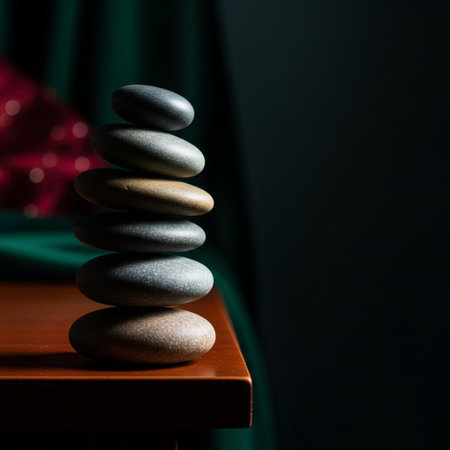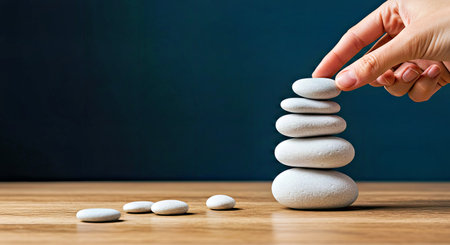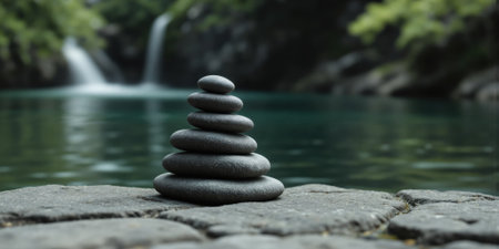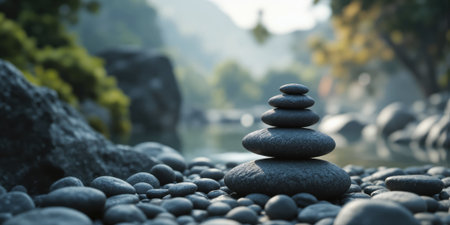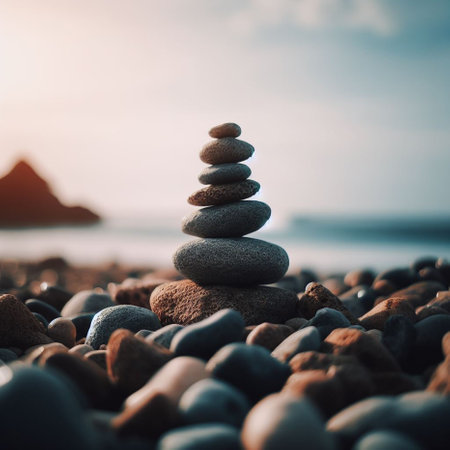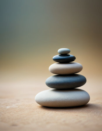 Stacked zen stones on a serene background, symbolizing balance and tranquility. Ideal for themes related to meditation, relaxation, and wellness.