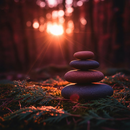 Peaceful Zen Garden with Balanced Stones and Pebbles Under Soft Shimmering Light Creating Serenity