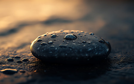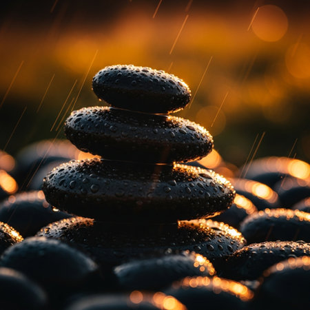 spa stones with drops of water on a background of the setting sun