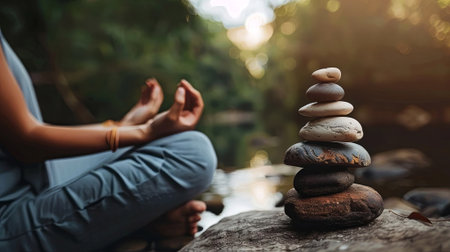 Zen tranquility meets nature beauty as stacked stones balance beside a meditating figure. Embrace calmness and harmony in this serene scene. Generated A.I.