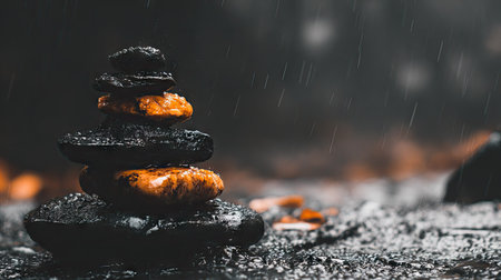 A carefully balanced stack of smooth, wet stones stands as a quiet monument to patience and tranquility.