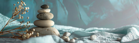 Soft, folded fabric provides a serene backdrop for a carefully stacked arrangement of smooth stones, illuminated softly by natural light, evoking tranquility and calmness.
