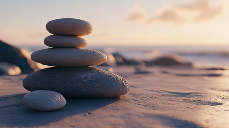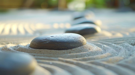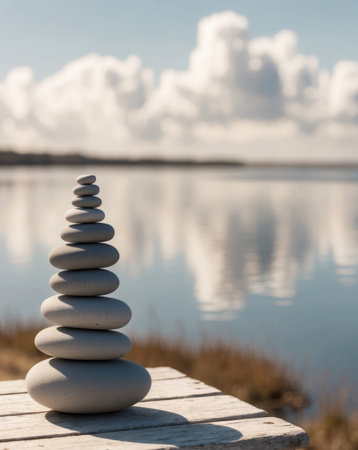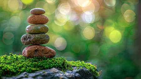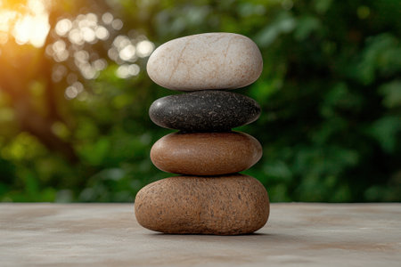 A tranquil zen garden scene featuring a carefully balanced arrangement of stones, embodying peace and harmony, ideal for inspiring relaxation and mindfulness in photography.