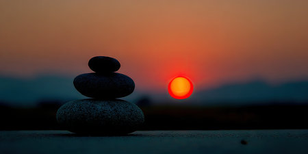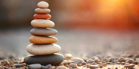 A stack of smooth, balanced stones is the central subject, set against a blurred background. The image displays warm tones from the setting sun, possibly near water. This composition may be suitable for wellness and meditation concepts, as well as editorial articles emphasizing balance.