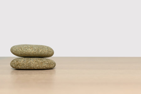 Two round stones on a wooden surface. Empty space for design. On a gray background.
