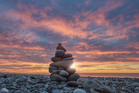 Stone balance on the beach at sunset. Pyramid of the small pebbles on the beach. Stones, against the background of the sea shore during sunset.