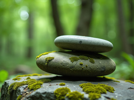 Zen stones with moss in the forest. Zen concept. Selective focus