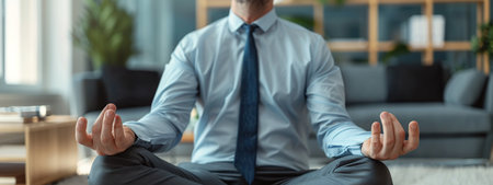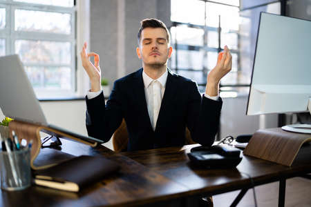 Businessman practicing meditation in office for relaxation and stress relief. Man sitting at desk with laptop , maintaining work-life balance and mindfulness
