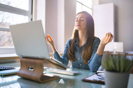 Young woman with close eyes near laptop at home office practicing meditation at table. Freelancer woman meditating near laptop. Taking break time during work. Healing from paperwork