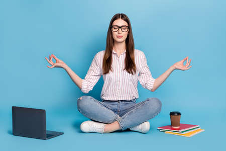 Portrait of beautiful trendy calm girl sitting doing homework meditating isolated over bright blue color background