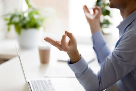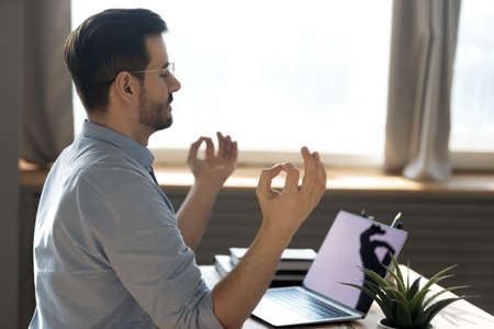 Close up young peaceful businessman making mudra gesture, deeply meditating sitting at workplace in front of computer. Mindful young male employee manager reducing work pressure stress at office.