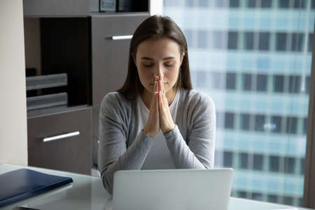 Hopeful wishful businesswoman with closed eyes praying, making wish, sitting at desk in modern office, religious young woman employee asking help, thinking about difficult work, problem solution