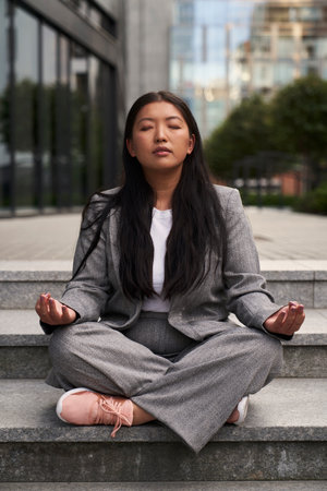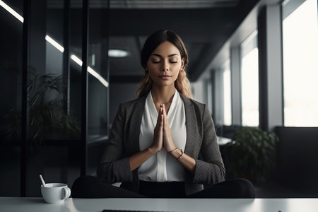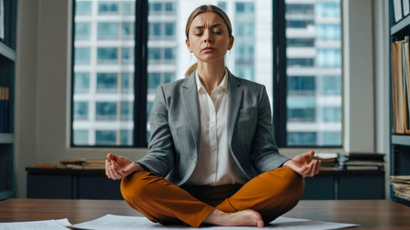 A businesswoman sits in a yoga pose in a modern office setting, finding inner peace amid the hustle and bustle of the city.