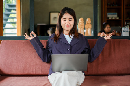 A young woman practices meditation while working on her laptop, promoting relaxation and mindfulness in a modern living room setting.