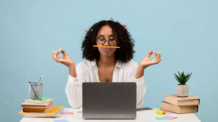 Workplace stress management. Silly black woman with pencils in her hair meditating in front of laptop on blue background