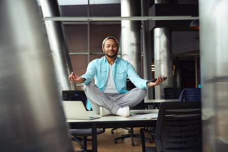 Handsome young man with curly hair engages in mindful meditation at work during a quiet moment.