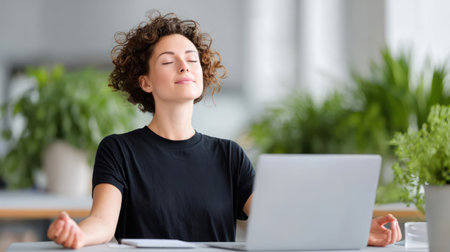 Woman calmly meditating during break at home office desk, peaceful mood.