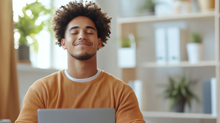 A young man sitting comfortably at a desk with a laptop. He appears relaxed and content, enjoying a moment of mindfulness in a cozy home environment with plants in the background.
