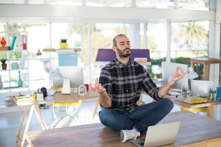 Relaxation at the work place, with a man sitting in lotus position on an office desk