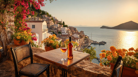 A beautiful balcony scene features a glass of wine and a bottle, with vibrant flowers and a stunning sunset view over the Mediterranean.