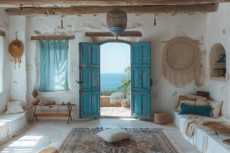 A white building with a turquoise door and windows is the focal point of the image. Lush green plants in terracotta pots flank the entrance. The building is set against a serene background of a bright blue sea and sky, bathed in daylight. This image could be used for travel, architecture, or design projects.