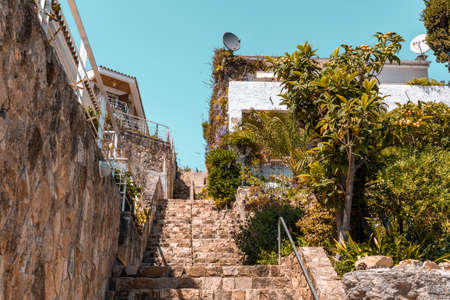 Explore a picturesque coastal pathway leading to a vibrant blue sea. Nestled between charming stone buildings and lush greenery, this scene captures the essence of Mediterranean tranquility.