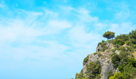 Capri Island and Blue Mediterranean Sea near Naples, Italy. Landscape at Italian coast. Panorama of Anacapri in Europe. View in summer. Beautiful Amalfi scenery and Solaro mountain