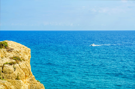 A view of the Mediterranean Sea of Cyprus from the viewpoint of Capo Greco National Park. A tourist motor boat is visible in the distance.